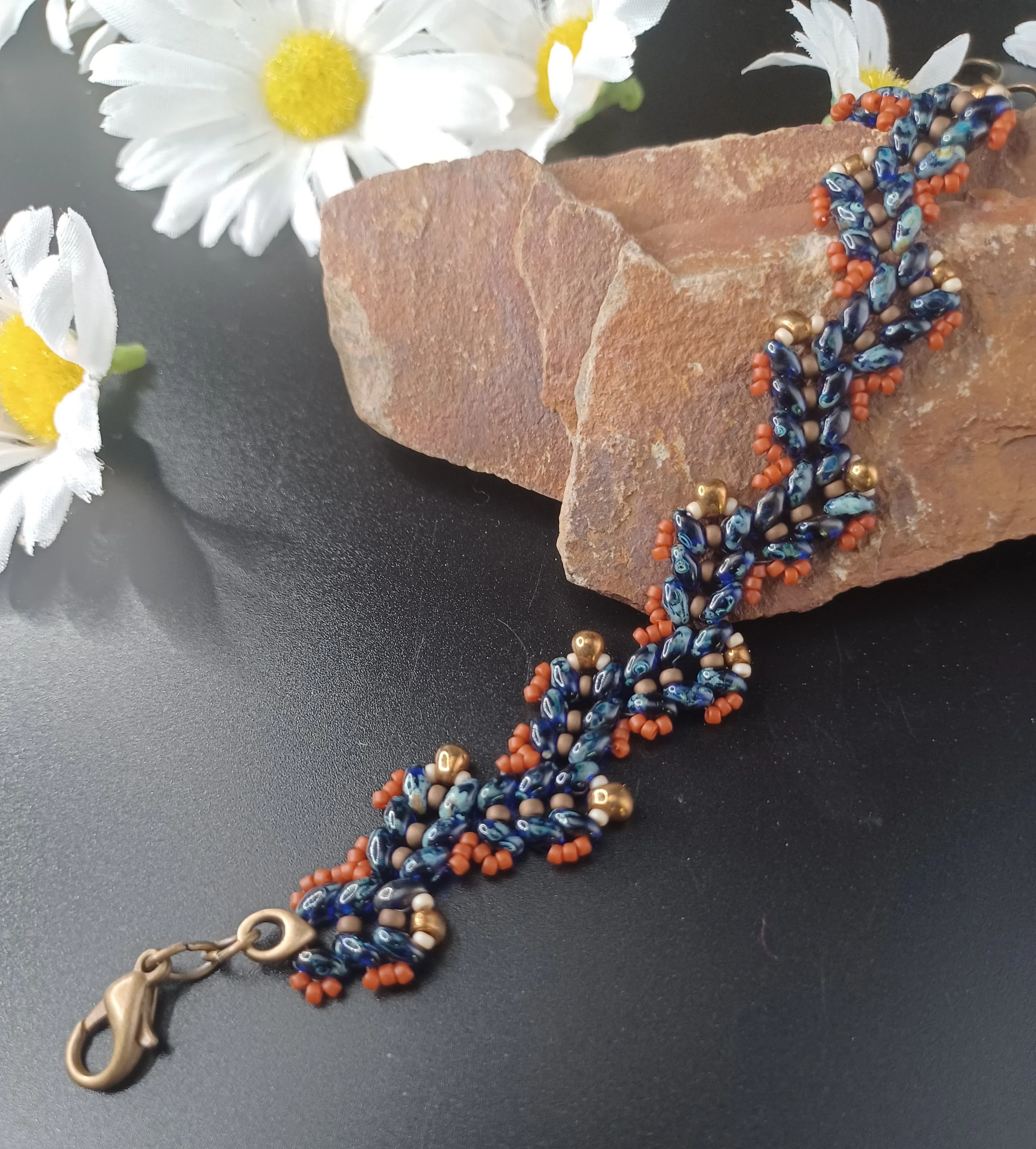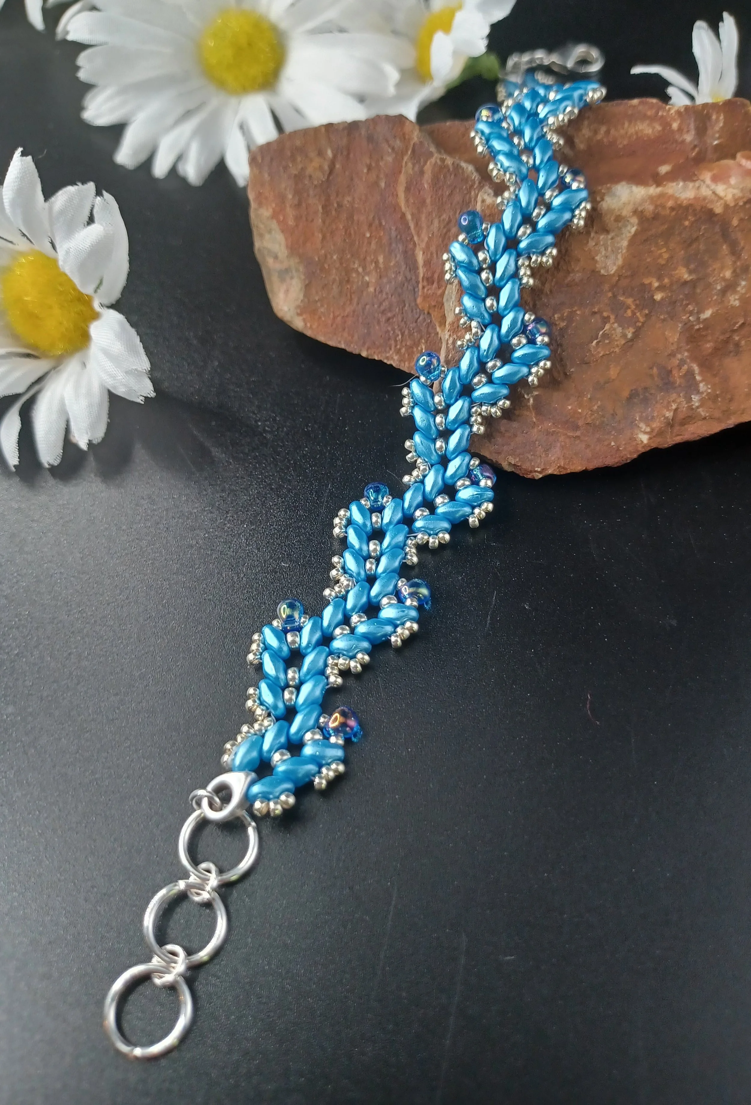 A very popular piece! The pattern evokes grains of wheat at harvest time. In many different colors. If you don’t see the color you’re looking for—contact me. The lobster class allows for the size to be adjusted. Inspired by a design by Allie Buchman.